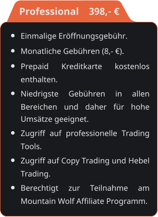 ERÖFFNEN SIE HIER IHR KONTO ERÖFFNEN SIE HIER IHR KONTO •	Einmalige Eröffnungsgebühr. •	Monatliche Gebühren (8,- €). •	Prepaid Kreditkarte kostenlos enthalten. •	Niedrigste Gebühren in allen Bereichen und daher für hohe Umsätze geeignet. •	Zugriff auf professionelle Trading Tools. •	Zugriff auf Copy Trading und Hebel Trading. •	Berechtigt zur Teilnahme am Mountain Wolf Affiliate Programm.    Professional    398,- € •	Einmalige Eröffnungsgebühr. •	Keine monatlichen Gebühren •	Prepaid Kreditkarte kostenlos enthalten. •	Niedrigere Gebühren als im Basic-Paket und daher für geringen bis mittleren Umsatz geeignet. •	Kein Zugriff auf professionelle Trading Tools. •	Keine Möglichkeit auf Copy Trading und Hebel Trading. •	Berechtigt zur Teilnahme am Mountain Wolf Affiliate Programm.    Standard    298,- € •	Keine Eröffnungsgebühr odermonatliche Gebühren. •	Prepaid Kreditkarte für einmalig 29,- €. •	Relativ hohe Gebühren, deshalb eher geeignet für geringen Umsatz. •	Kein Zugriff auf professionelle Trading Tools. •	Keine Möglichkeit auf Copy Trading und Hebel Trading.    Basic